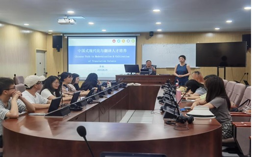 6月29日,党委委员、副经理李航以"中国式现代化与翻译人才培养"为主题,为研究生支部全体党员讲授了专题党课。李航副经理从什么是中国式现代化以及中国式现代化的主要内涵、特征着手,和同学们探讨了翻译人才培养的新理念和新方向。他强调,通过加快构建自主翻译知识体系、自主翻译教育体系、自主翻译科技创新体系等三个自主翻译体系,以及提升国家翻译服务能力、国家翻译出口能力、国家翻译科技创新能力等三个能力目标,来解决新时代翻译人才培养面临的问题。