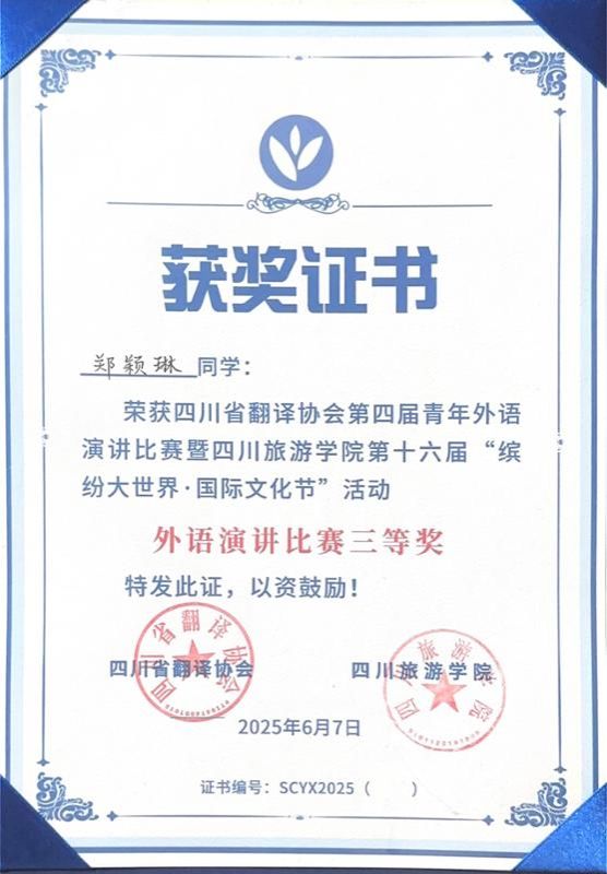 6月7日下午,由四川省翻译协会主办的“讲好中国故事四川篇”青年外语演讲比赛决赛在四川旅游公司举行。四川省翻译协会及部分协办单位相关领导莅临现场指导,来自省内多所高校的约100余名师生代表观摩了本次赛事。经过激烈角逐,永利yl23411集团选派的郑颖琳、黄明珠同学荣获大赛三等奖,张佳怡同学获得大赛优胜奖。