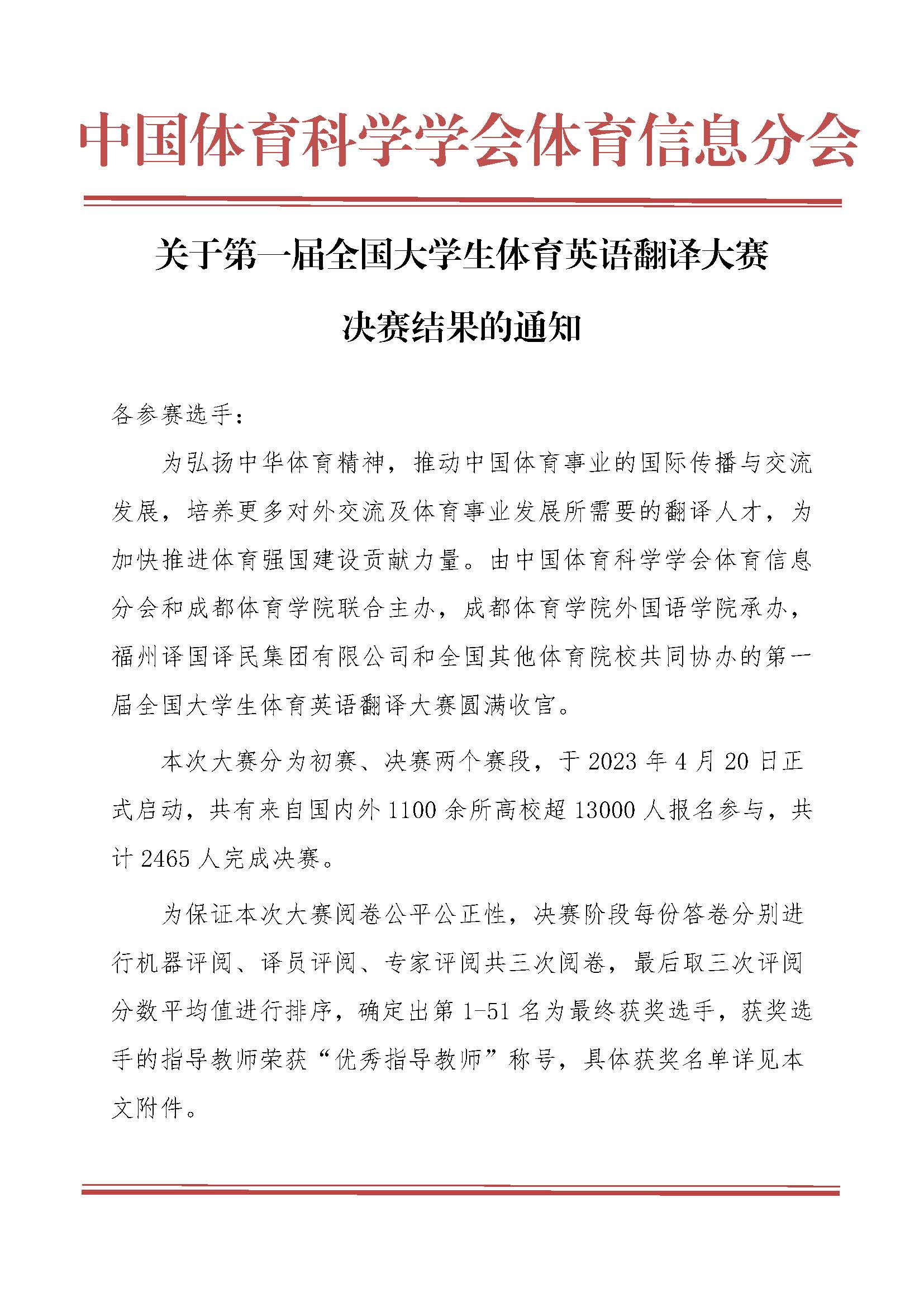 关于第一届全国老员工体育英语翻译大赛决赛结果的通知