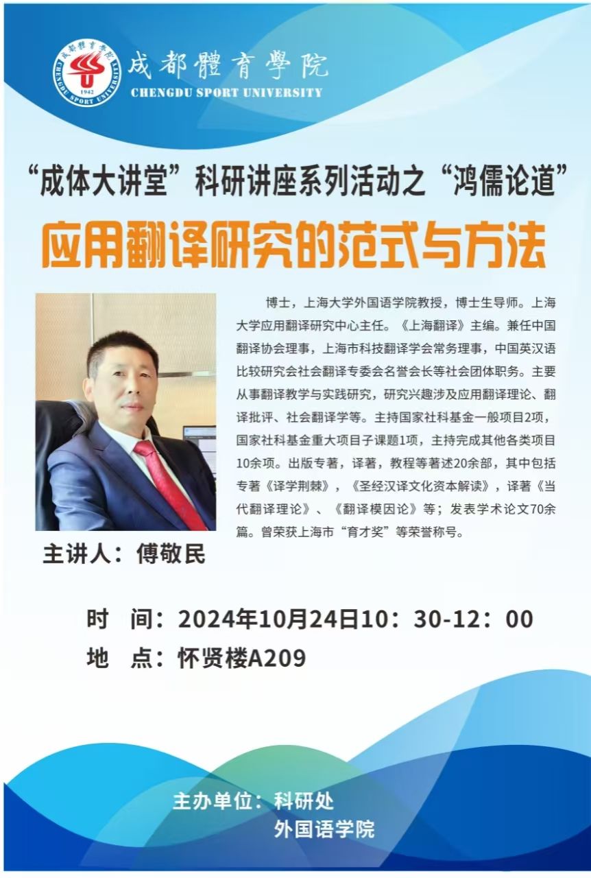 集团将于2024年10月24日(周四)上午10:30在怀贤楼A209举行“成体大讲堂”科研讲座系列活动之“鸿儒论道”讲座。本次讲座/沙龙特邀上海大学傅敬民教授主讲。题目为:《应用翻译研究的范式与方法》。欢迎全校师生积极参加。
