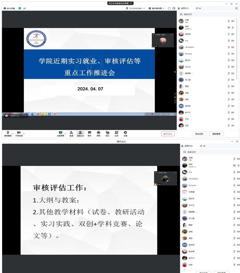 最后,副经理袁彬安排了实习指导、实习答辩、毕业论文等工作,并重点强调了近期的审核评估工作,尤其是课程大纲与教案的核查和完善、教学材料的整理与归档等,同时要求广大教职员工要进一步提高认识,严格把控时间节点与任务要求,确保各项重点工作高质量完成。