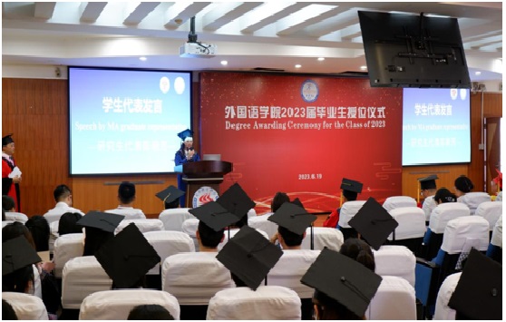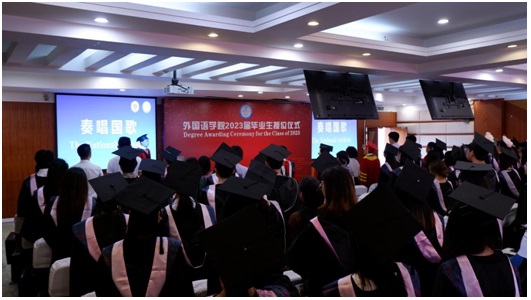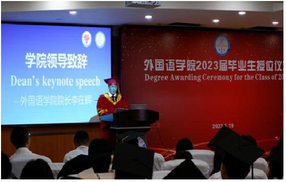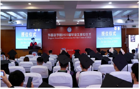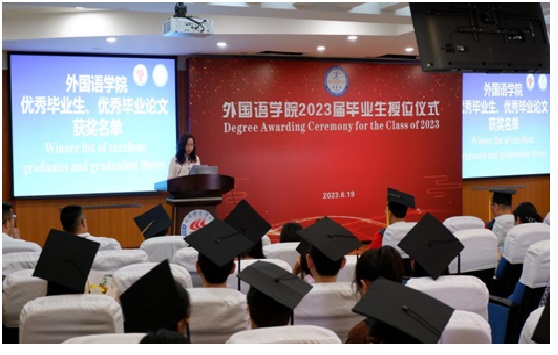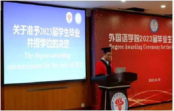 6月19日14:30,永利yl23411集团2023届毕业生授位仪式在怀贤楼同传室隆重举行。永利yl23411集团全体教师、2023届全体毕业生参加了此次授位仪式。仪式以双语形式进行,副经理袁彬主持授位仪式。