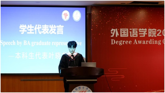 2019级本科生叶晓龙、2020级硕士研究生陈晓芳作为毕业生代表发言,他们表达了对母校、对老师们以及对同学们的深切谢意。