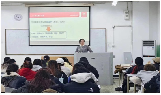 讲座开始,白鸥老师从翻译人才的培养与自我成长的角度,深入讲解了笔译尤其是口译员的培养与自我成长之路。她强调,口译员不仅需具备扎实的语言基础和翻译技术,还需具备良好的心理素质和随机应变的能力,尤其要重视回译在加强表达方面的关键作用,并提供了解决问题的具体建议和相关学习资料。